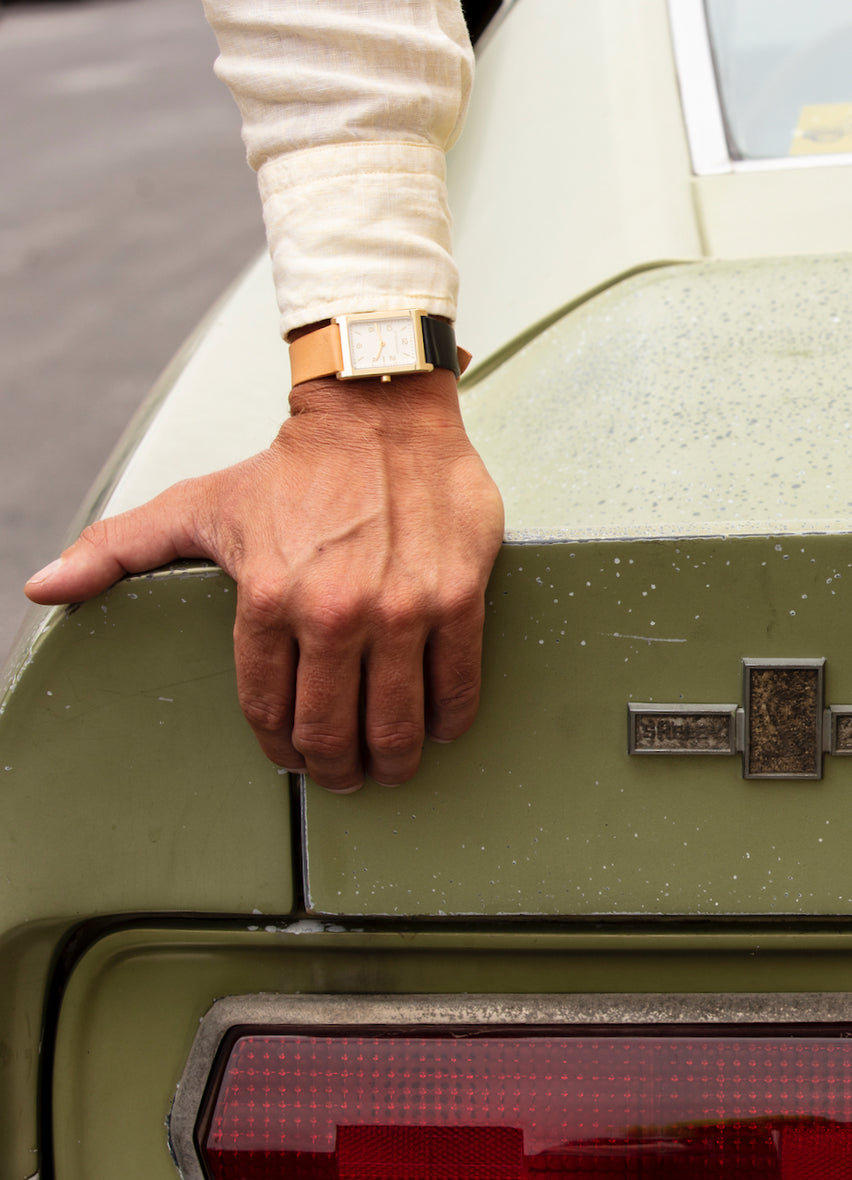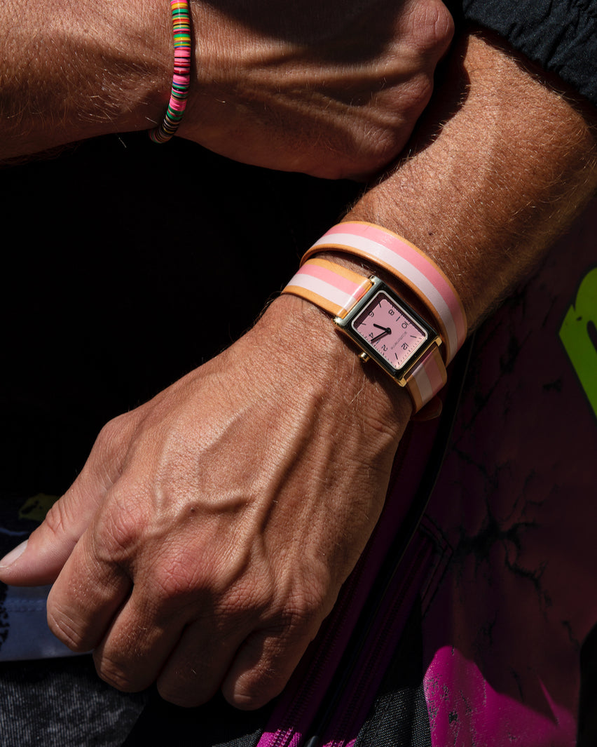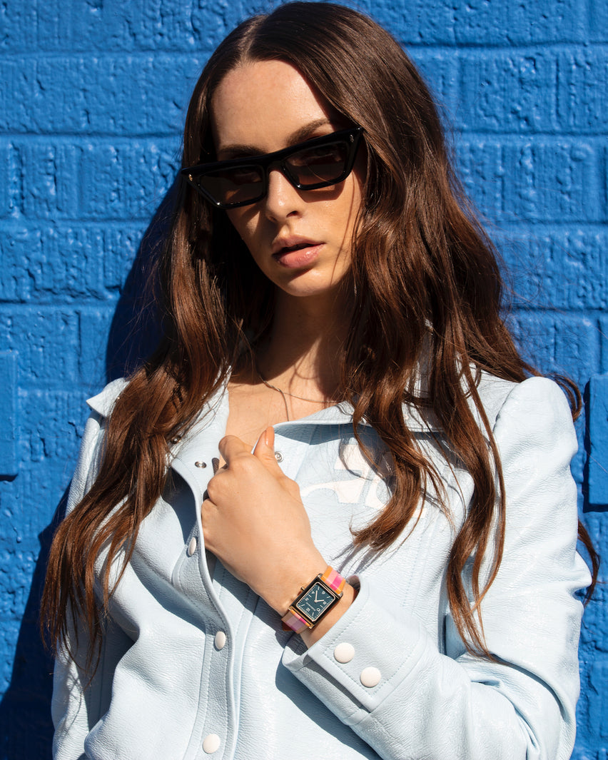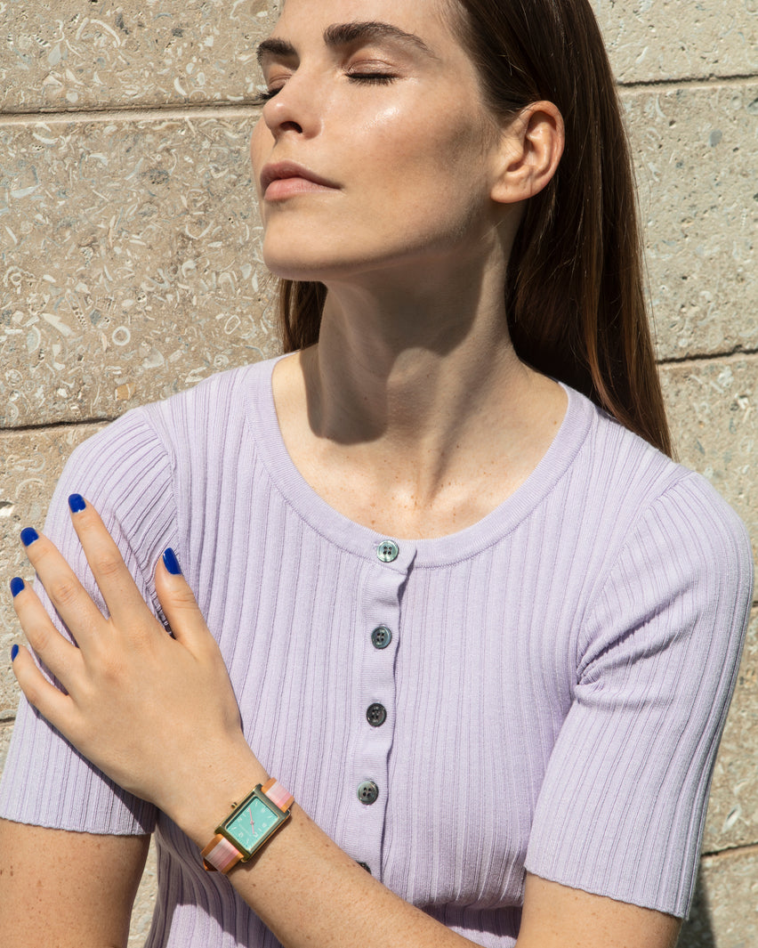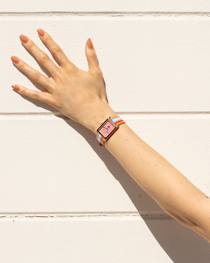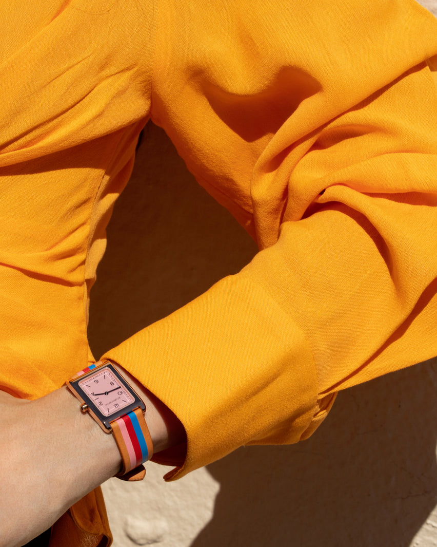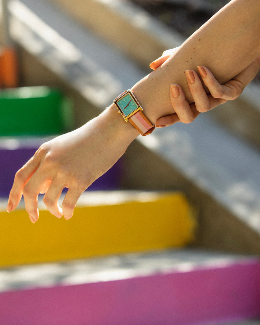 Inspired by a new dawn, our Daybreak watch is mid-size - not too small or too big. It features a rectangular case design that is highlighted by its polished finish and striking side angles; depending on how the light hits the case, new angles seem to appear. If you take a close look, you will notice that the crown features a vertical stripe motif inspired by our signature straps and is capped by a gemstone that plays off the colorway. Our straps are handmade using full grain natural vegetable tanned leather. The edges are burnished with natural oils and beeswax. The stripes are hand-painted. Over time, the leather will become supple and develop a unique golden hue patina.