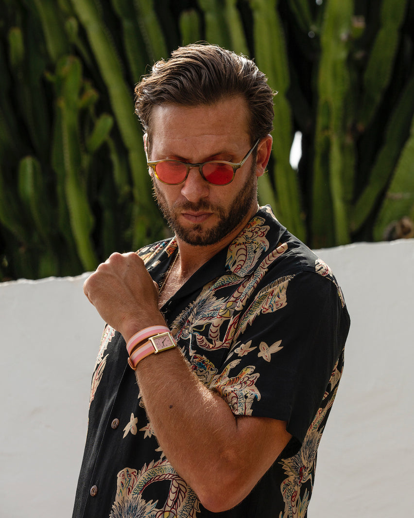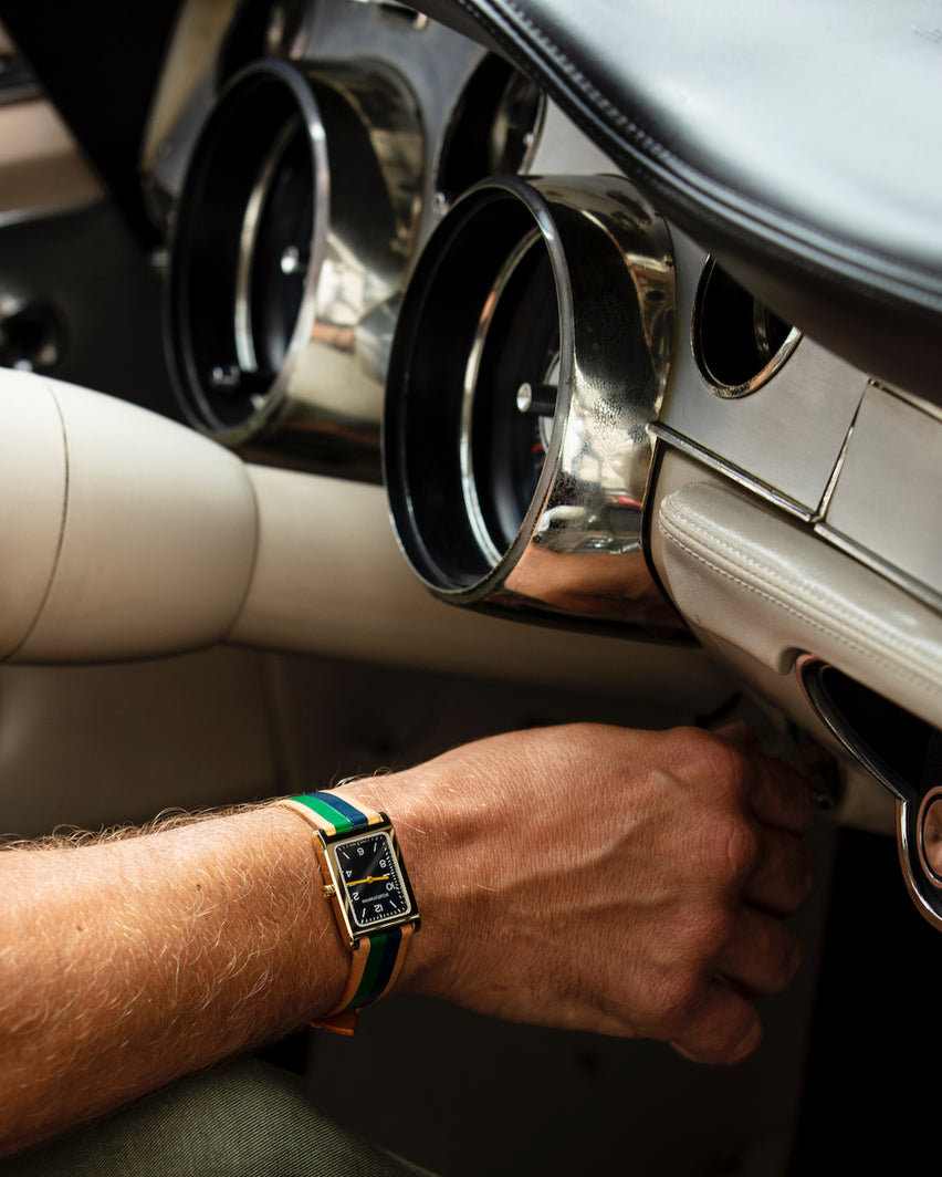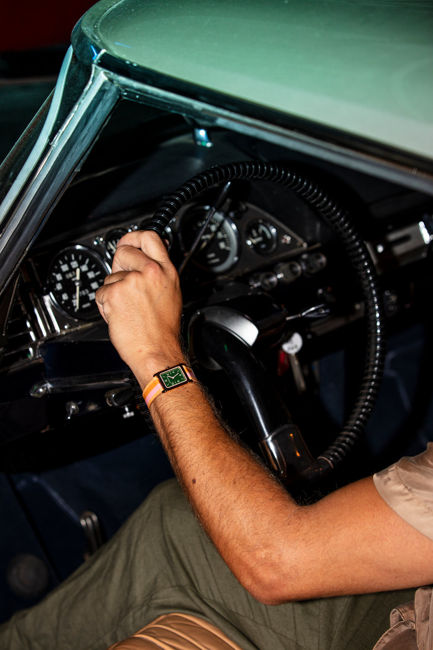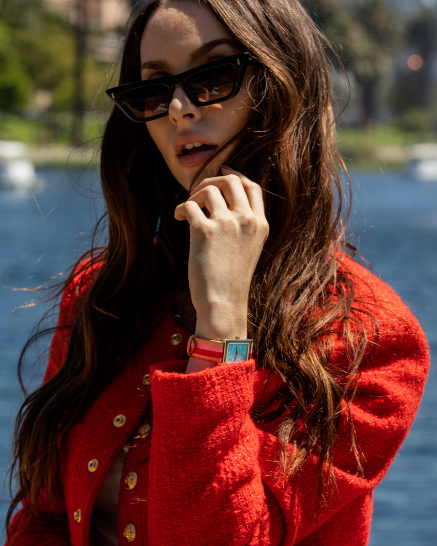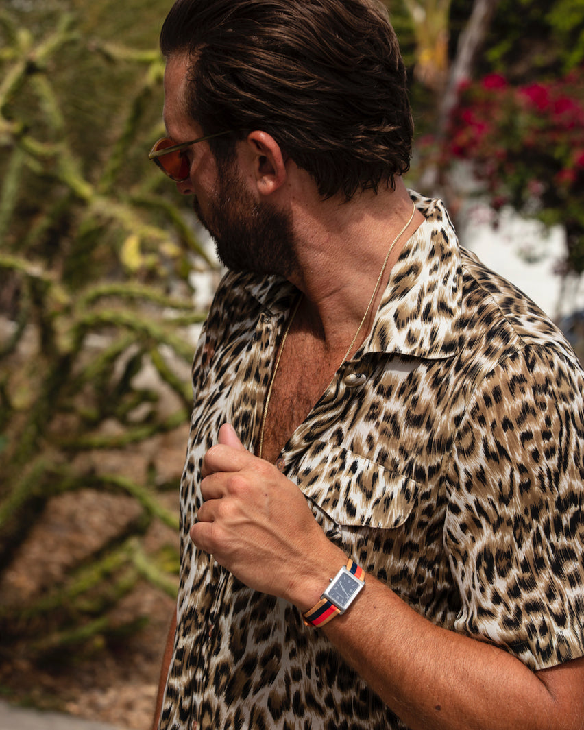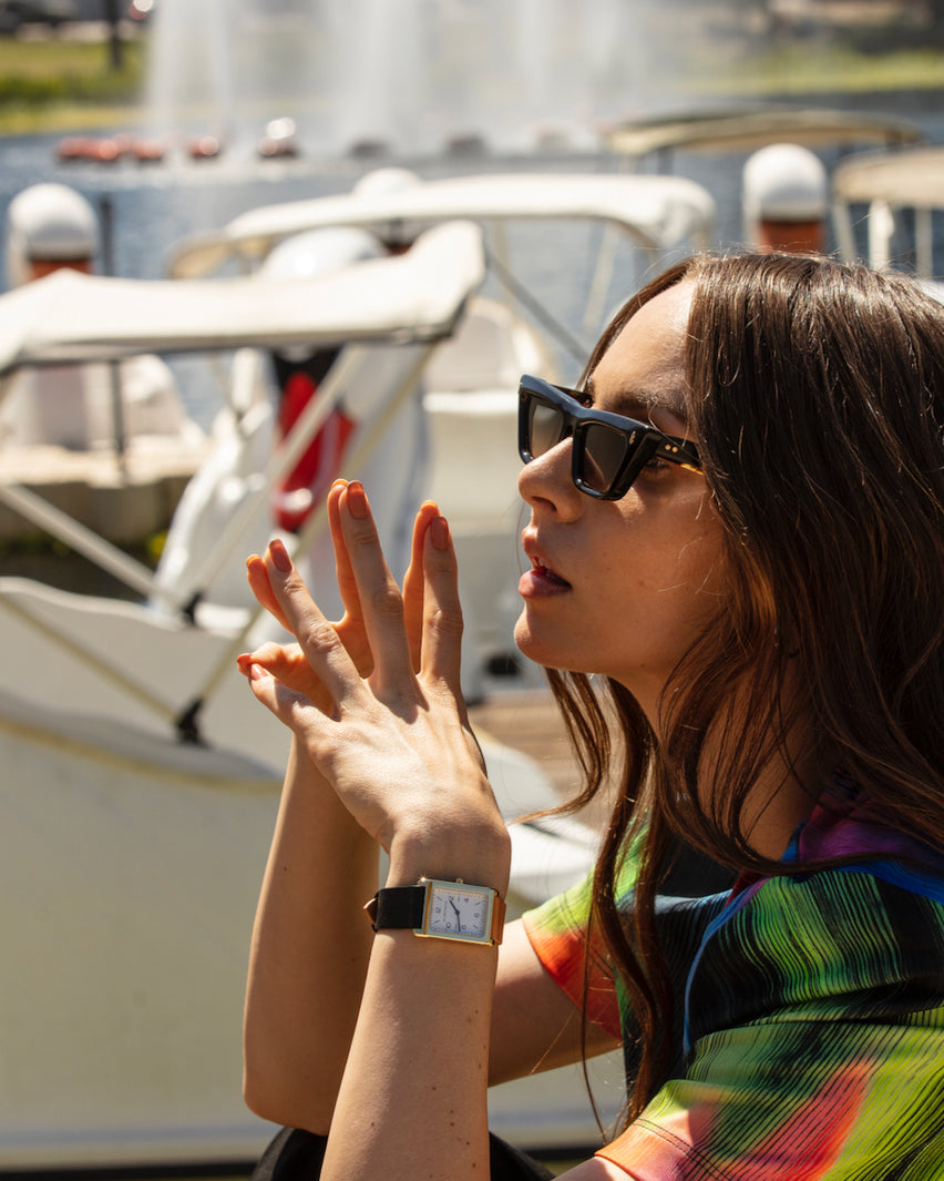 Inspired by a new dawn, our Daybreak watch is mid-size - not too small or too big. It features a rectangular case design that is highlighted by its polished finish and striking side angles; depending on how the light hits the case, new angles seem to appear. If you take a close look, you will notice that the crown features a vertical stripe motif inspired by our signature straps and is capped by a gemstone that plays off the colorway. Our straps are handmade using full grain natural vegetable tanned leather. The edges are burnished with natural oils and beeswax. The stripes are hand-painted. Over time, the leather will become supple and develop a unique golden hue patina.